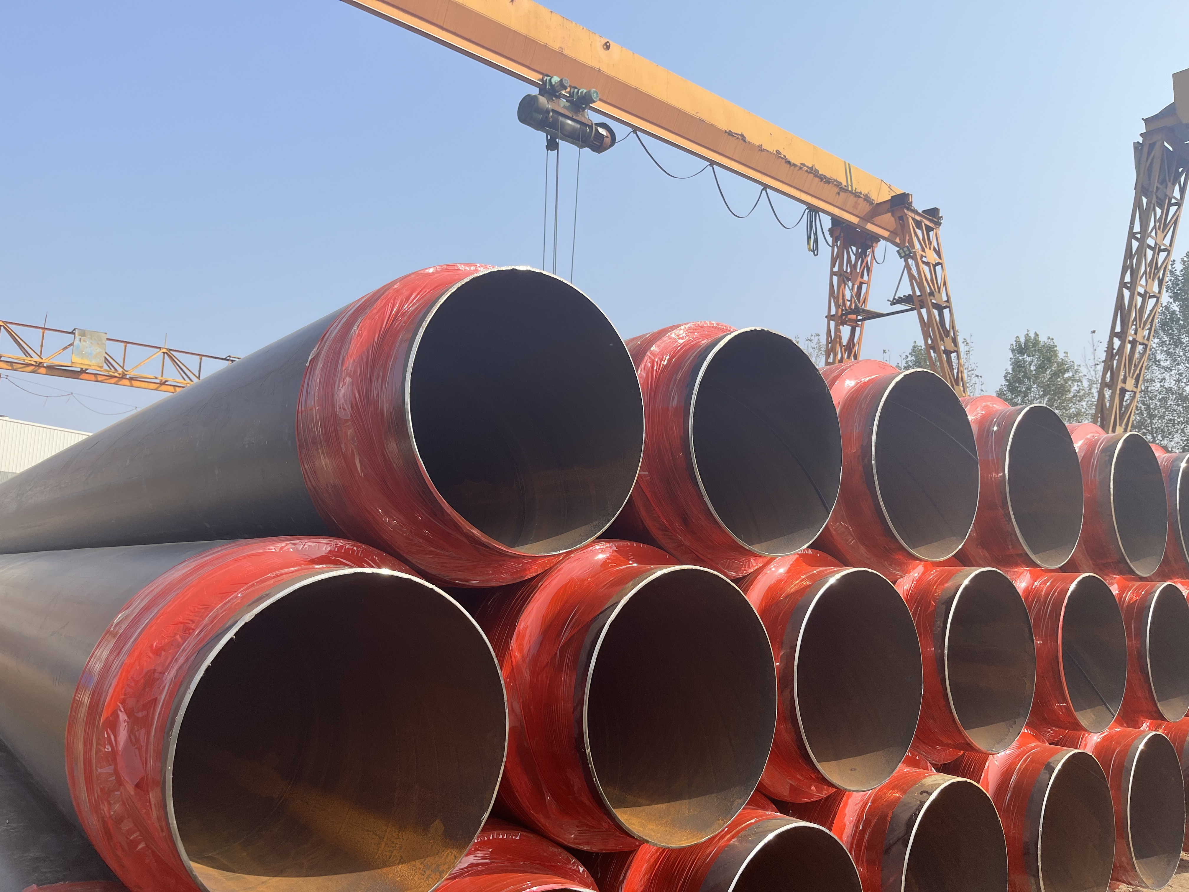 直埋保温管具有众多显著的行业优势和特点。从结构上看,以常见的地埋保温管为例,它采用三层一体化预制工艺,集输送、保温、防腐于一体。内部是优质钢管,如DN150及以下用无缝钢管(执行GB8163)、DN200及以上用螺旋缝焊管(执行GB9711),符合国标标准,能适配不同管径的介质输送需求,保障承压稳定性。中间的硬质聚氨酯泡沫保温层更是关键,其保温效率高,导热系数≤0.033W/(m・℃),能大幅减少介质(热水/蒸汽等)的热量损耗;防潮抗渗性能出色,孔隙率≥88%且吸水率≤10%,能长期阻隔地下水渗入,保持保温层干燥,避免保温效果衰减;抗挤压耐用性强,抗压强度≥0.3MPa,埋地后可抵抗土壤挤压,不易变形损坏。外部搭配的高密度聚乙烯或防腐钢质外护层,物理性能优异,拉伸强度≥19MPa、断裂伸长率≥350%,韧性强,能抵抗埋地环境的摩擦、挤压;抗老化耐腐蚀,耐环境应力开裂≥200h,适配地下复杂腐蚀环境,长期使用不易破损;尺寸稳定性好,纵向回缩率≤3%,高温下不易变形,保障外护层的防护效果。这种多层防护结构,既保障了蒸汽输送的安全性,又能抵御埋地环境的腐蚀、挤压,防护维度更全面。同时,直埋保温管无需敷设传统管沟,可直接直埋铺设,能够大幅缩短施工周期、降低工程成本。其适用于 -50℃~120℃ 低温至中温流体输送,应用场景广泛,涵盖城市集中供热管网、市政制冷工程、工业流体输送、民用建筑配套等多个领域。